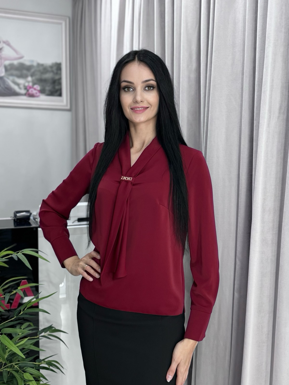 Блуза в офисном стиле. Модель прямого кроя, с длинным рукавом на широком манжете. Воротник с отворотом выполнен в виде галстука.