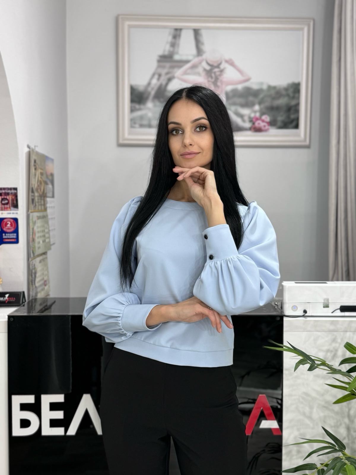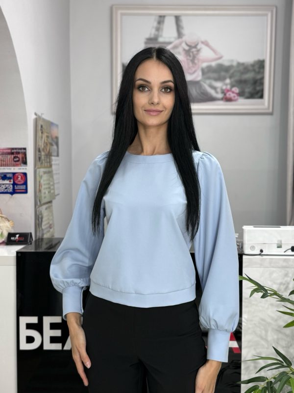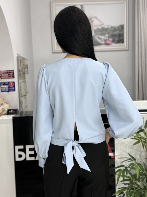 Блуза с бантиком. Модель прямого кроя, средней длинны. рукав аккуратный фонарик на широком манжете. По низу узкая планка, переходящая в завязки сзади.