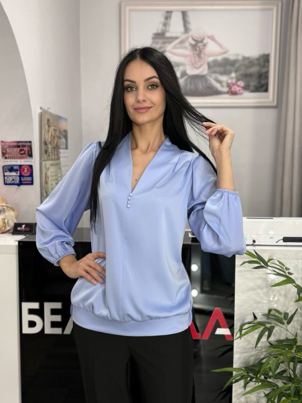 Нарядная блуза из плотной ткани. Модель прямого кроя на планке снизу. Воротник в виде стойки, переходящий в V-образный вырез. Блуза без вытачек, с защипами от плеча. Рукав аккуратный фонарик, снизу на резинке.
