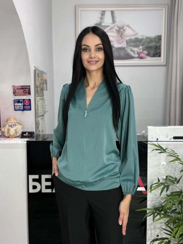 Нарядная блуза из плотной ткани. Модель прямого кроя на планке снизу. Воротник в виде стойки, переходящий в V-образный вырез. Блуза без вытачек, с защипами от плеча. Рукав аккуратный фонарик, снизу на резинке.