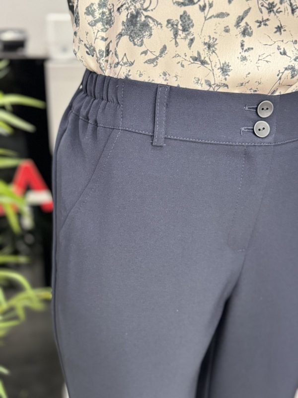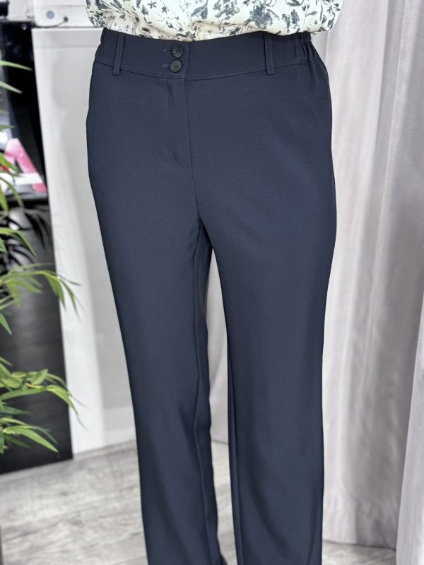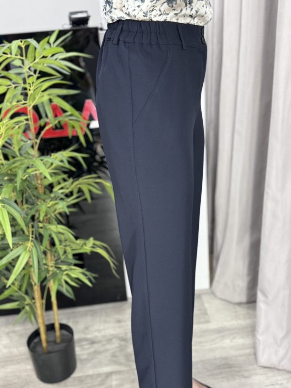 Брюки в синем цвете. Модель классическая , прямого кроя. На молнии и двух пуговицах. Имеются резинки по бокам. В боковых швах имитация карманов.