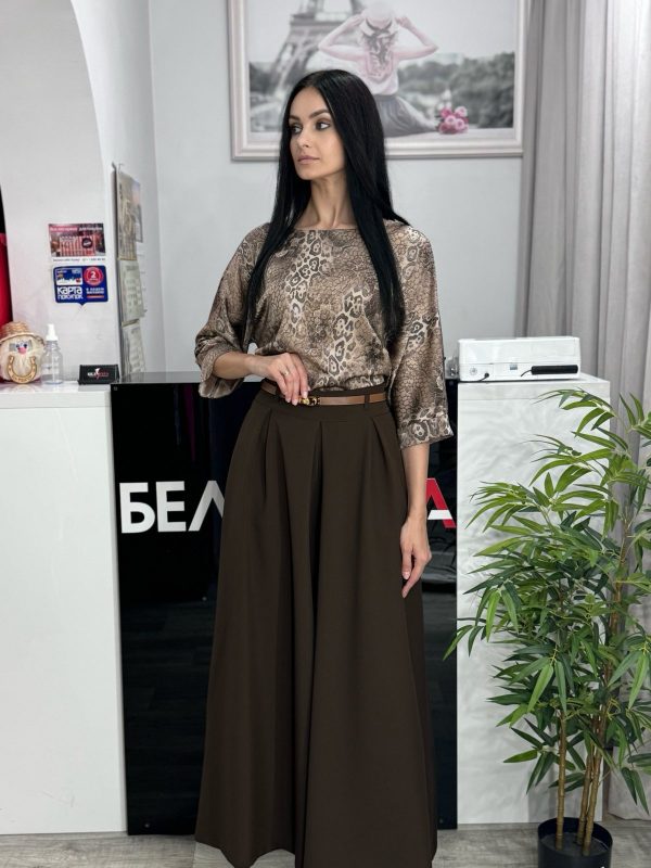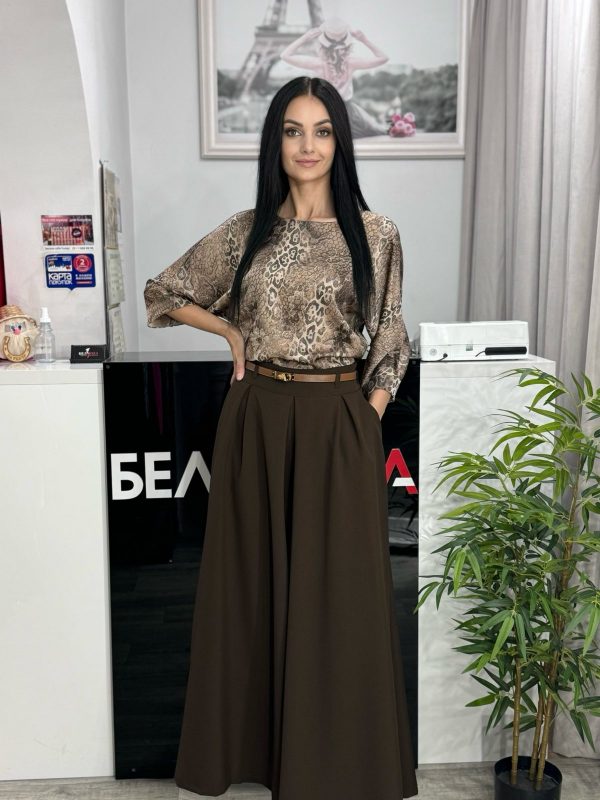 Брюки-юбка в коричневом цвете . Спереди встречные защипы, которые расширяют брюки к низу. Сзади резинка и молния. В боковых швах карманы. РЕМЕНЬ В КОМПЛЕКТ НЕ ВХОДИТ!