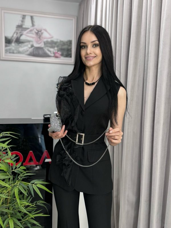 Эксклюзивная жилетка с декором из органзы. Классическая модель средней длины. В комплекте пояс из основной ткани с акцентной блестящей пряжкой.