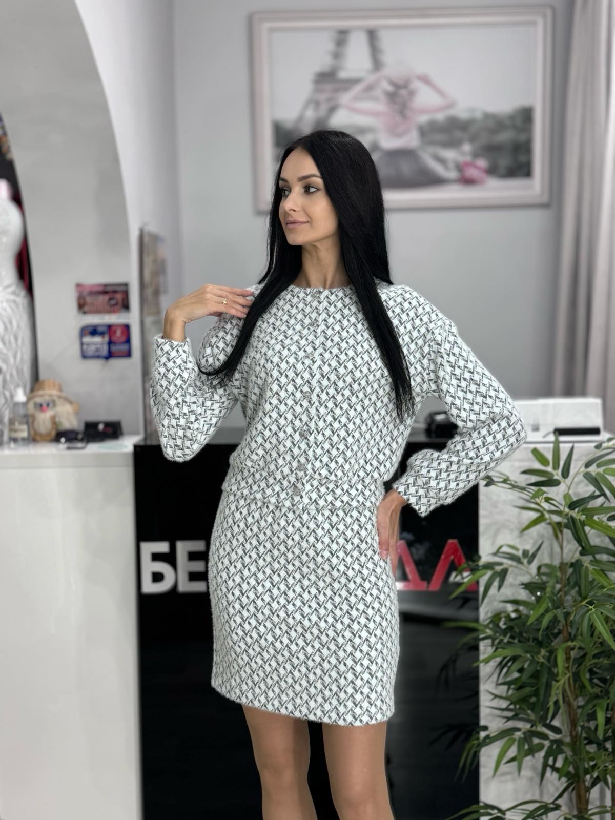 Костюм с юбкой из пушистой теплой ткани. Кофта прямого кроя, на планке снизу, полностью на пуговицах. Юбка прямого кроя, на круговой резинке.