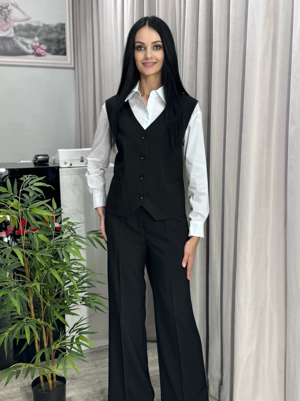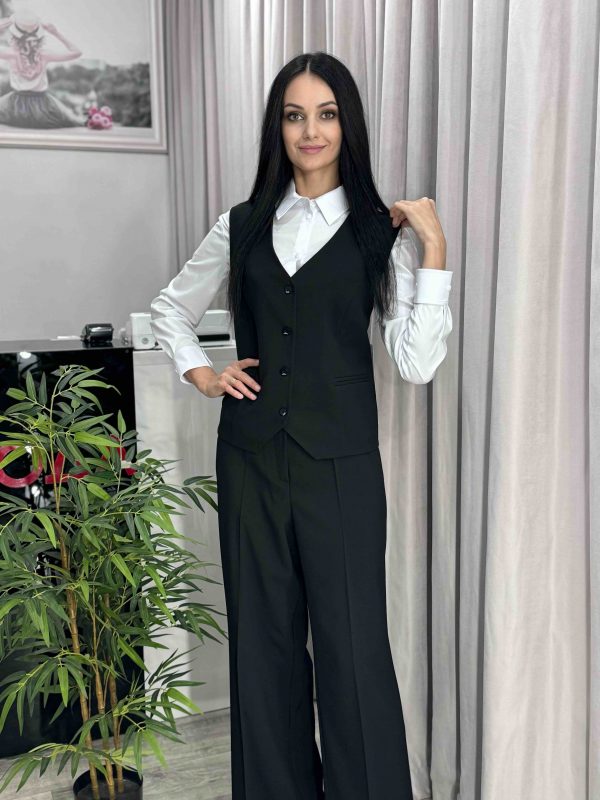 Брючный комплект, состоящий из жилета и брюк. Жилет прямого кроя на пуговицах. Брюки прямого кроя со стрелками, карманами и резинкой по спинке.