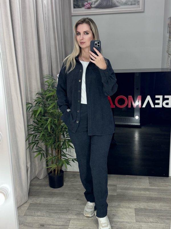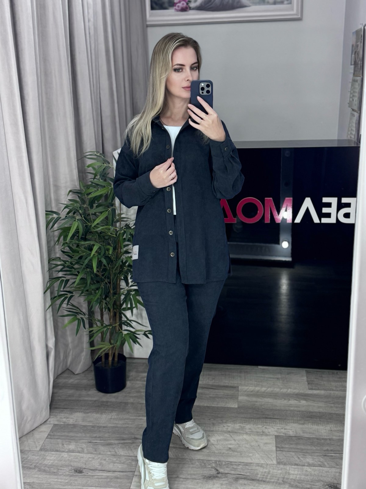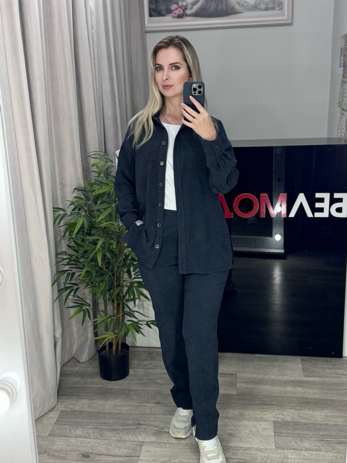 Штроксовый брючный костюм . Рубашка свободного кроя со спущенной линией плеча, полностью на пуговицах. Брюки классические, немного приужены к низу. Застегиваются на молнию и пуговицу, сзади на резинке.