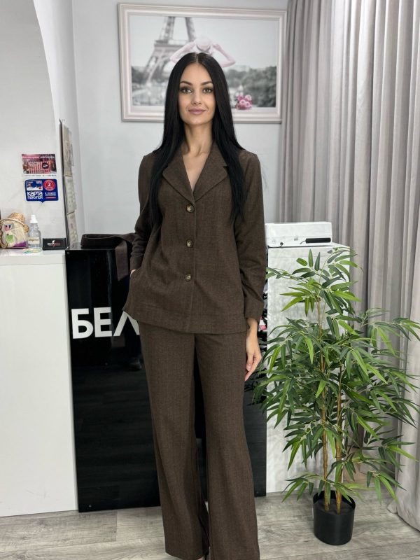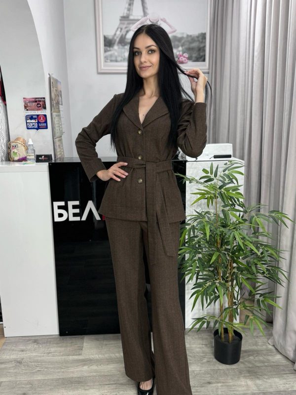 Теплый брючный костюм в цвете «Шоколад». Жакет свободного кроя на три пуговицы с разрезами по бокам. Брюки прямые, не широкие, с резинкой сзади, в боковых швах карманы. Пояс из основной ткани в комплекте.