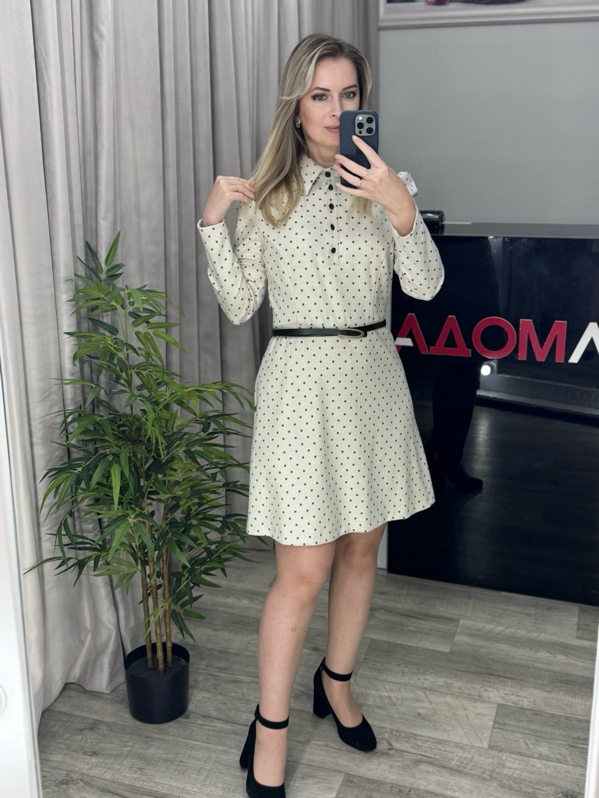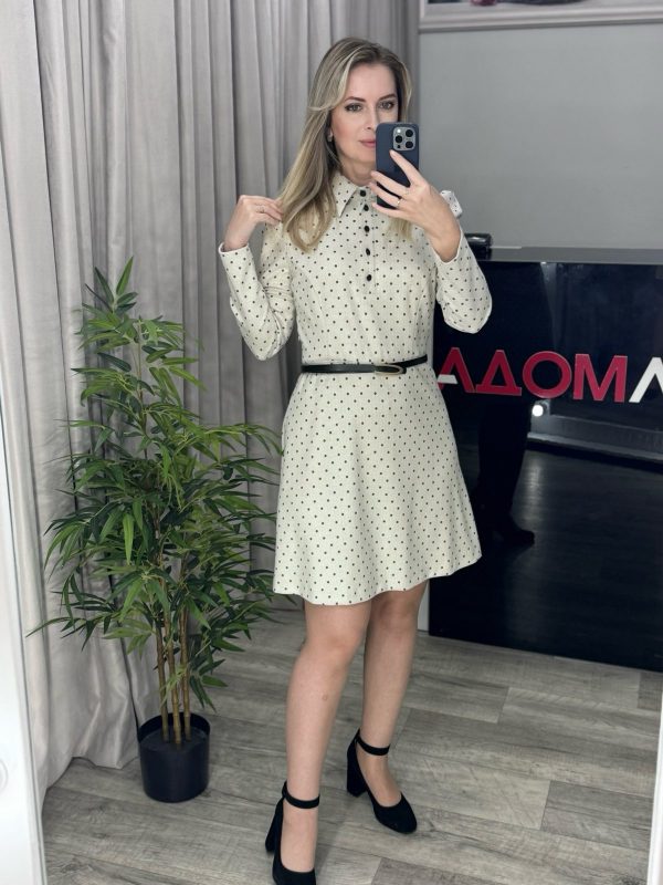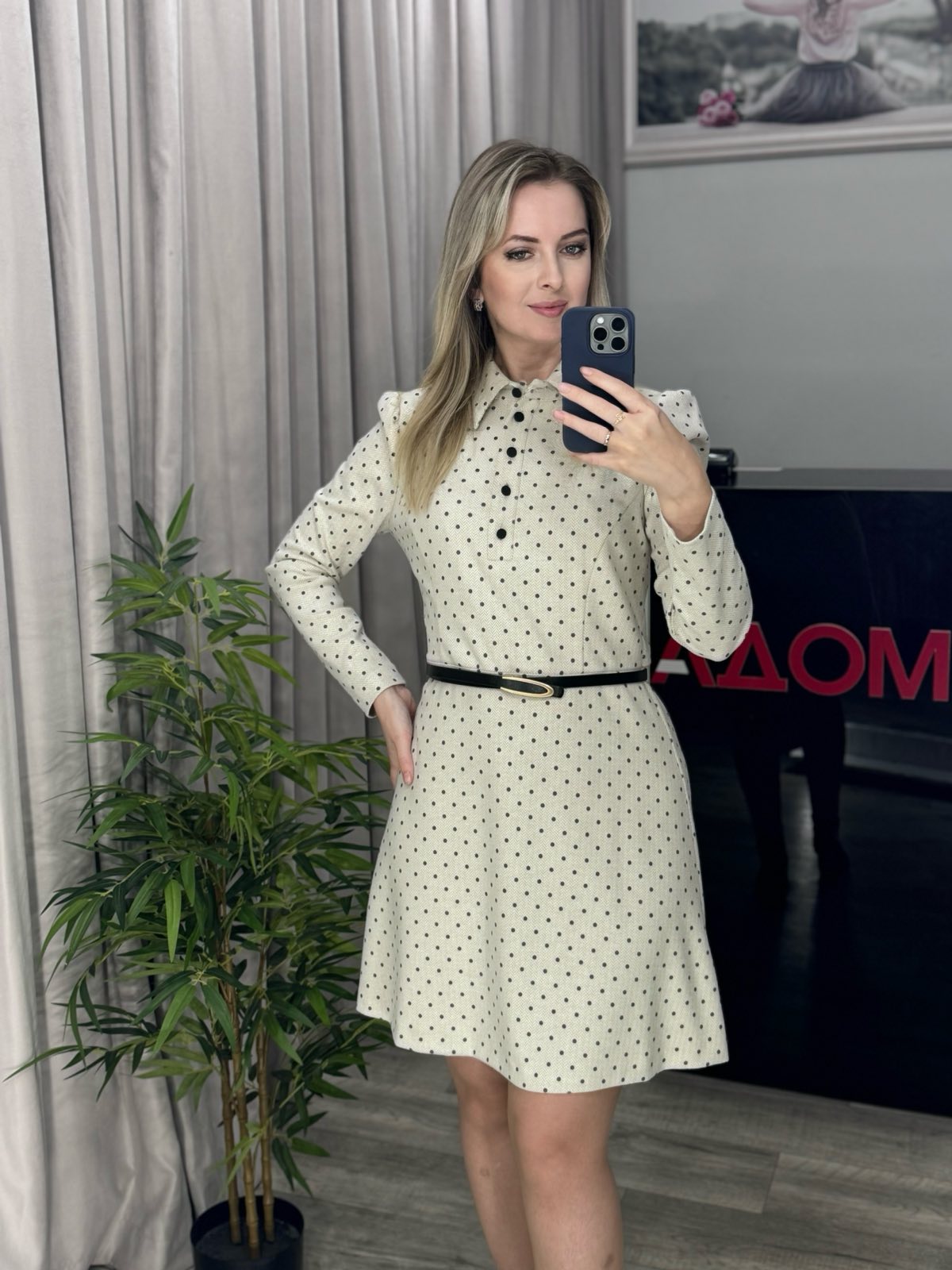 Теплое трикотажное платье. Модель с воротником в виде рубашки, сверху на пуговицах. Платье отрезное, трапециевидной формы. Ремень в комплекте.