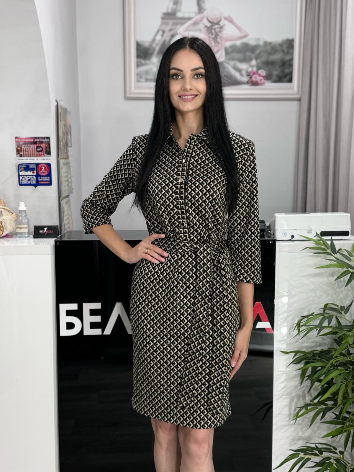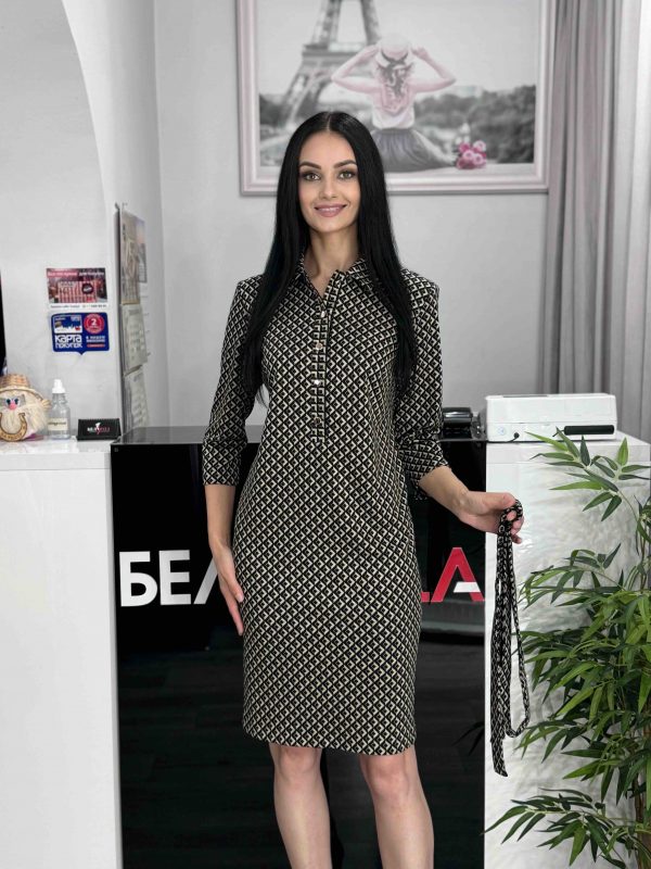 Платье из мягкого трикотажа. Модель полуприлегающего силуэта. Воротник рубашечного типа. По груди застежка на акцентные пуговицы. Рукав втачной 3/4. Пояс из основной ткани в комплекте.