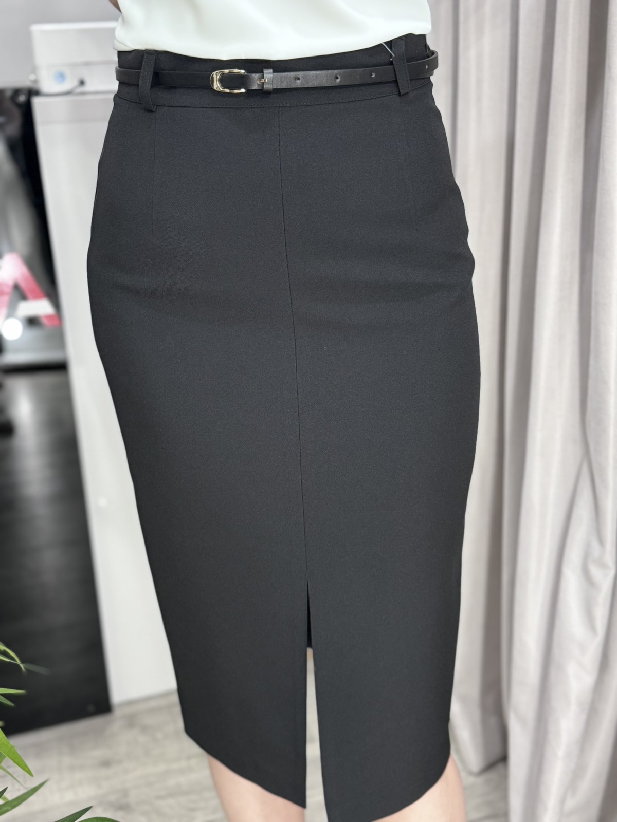 Стильная юбка с высокой талией в длине ниже колена. Модель силуэтного кроя с небольшим разрезом спереди. Ремешок в комплекте.