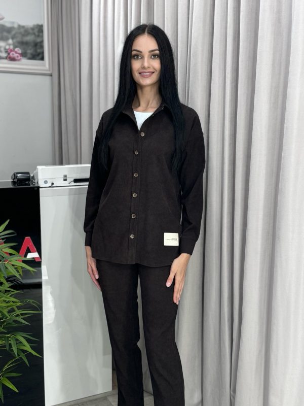 Штроксовый брючный костюм в цвете «шоколад». Рубашка свободного кроя со спущенной линией плеча, полностью на пуговицах. Брюки классические, немного приужены к низу. Застегиваются на молнию и пуговицу, сзади на резинке.