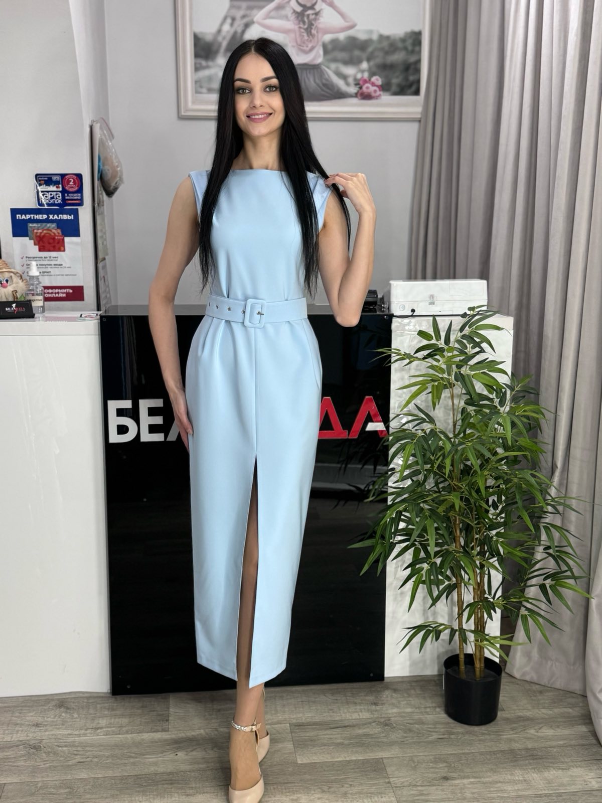 Платье в длине «макси». Модель без рукавов с защипами по плечам. Отрезная по талии с поясом из основной ткани в комплекте. В боковых швах карманы, спереди разрез. По спинке V-образный вырез и молния.