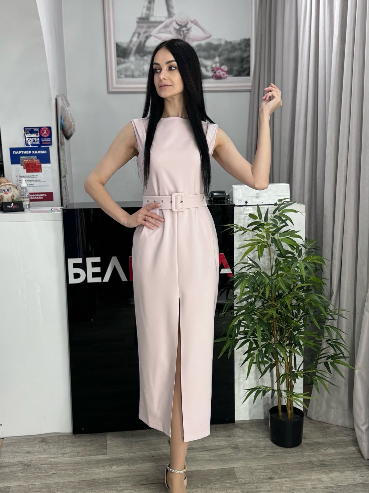 Платье в длине «макси». Модель без рукавов с защипами по плечам. Отрезная по талии с поясом из основной ткани в комплекте. В боковых швах карманы, спереди разрез. По спинке V-образный вырез и молния.