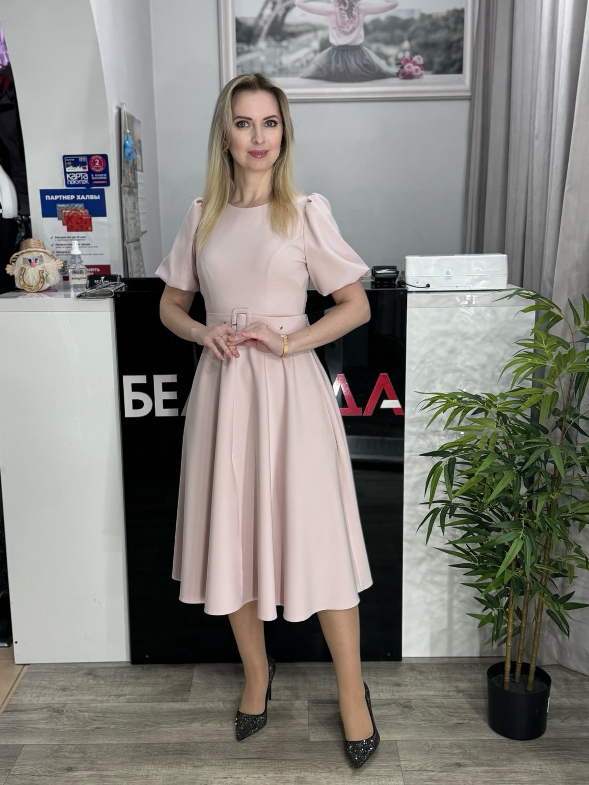 Платье в цвете «пудра». Модель отрезная, верх силуэтный с втачным, не длинным рукавом фонариком на манжете. Низ расклешенный с разрезом посередине. Ремень из основной ткани в комплекте.