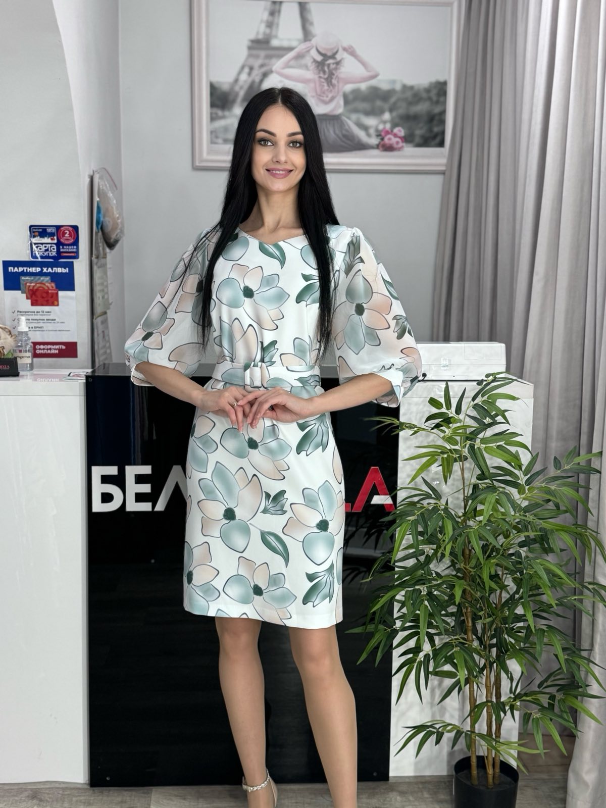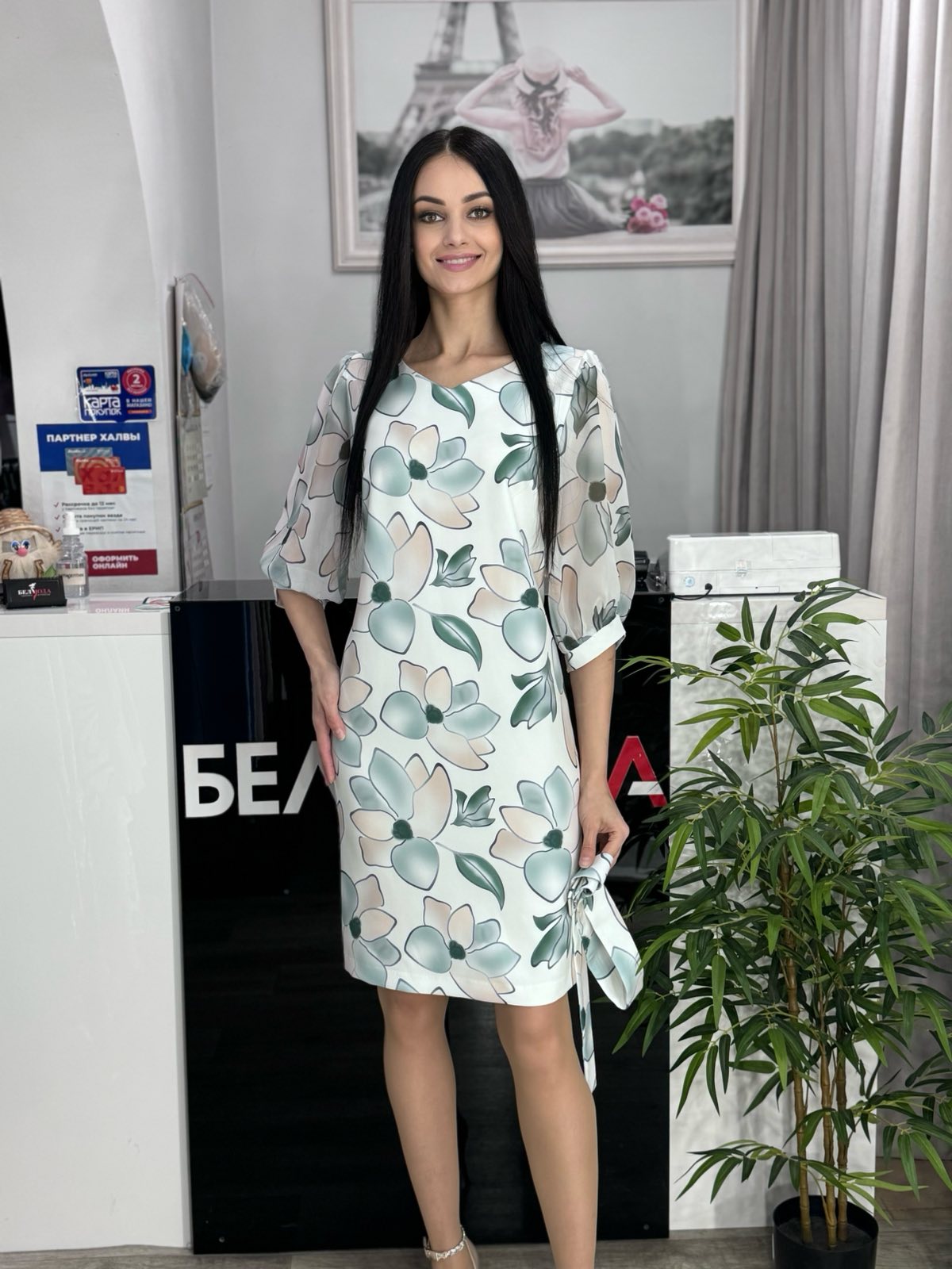 Платье в цветочном принте. Модель полуприталенного силуэта. Основное полотно из плательной ткани, принт так же дублируется на шифоновом рукаве. Пояс из основной ткани в комплекте.