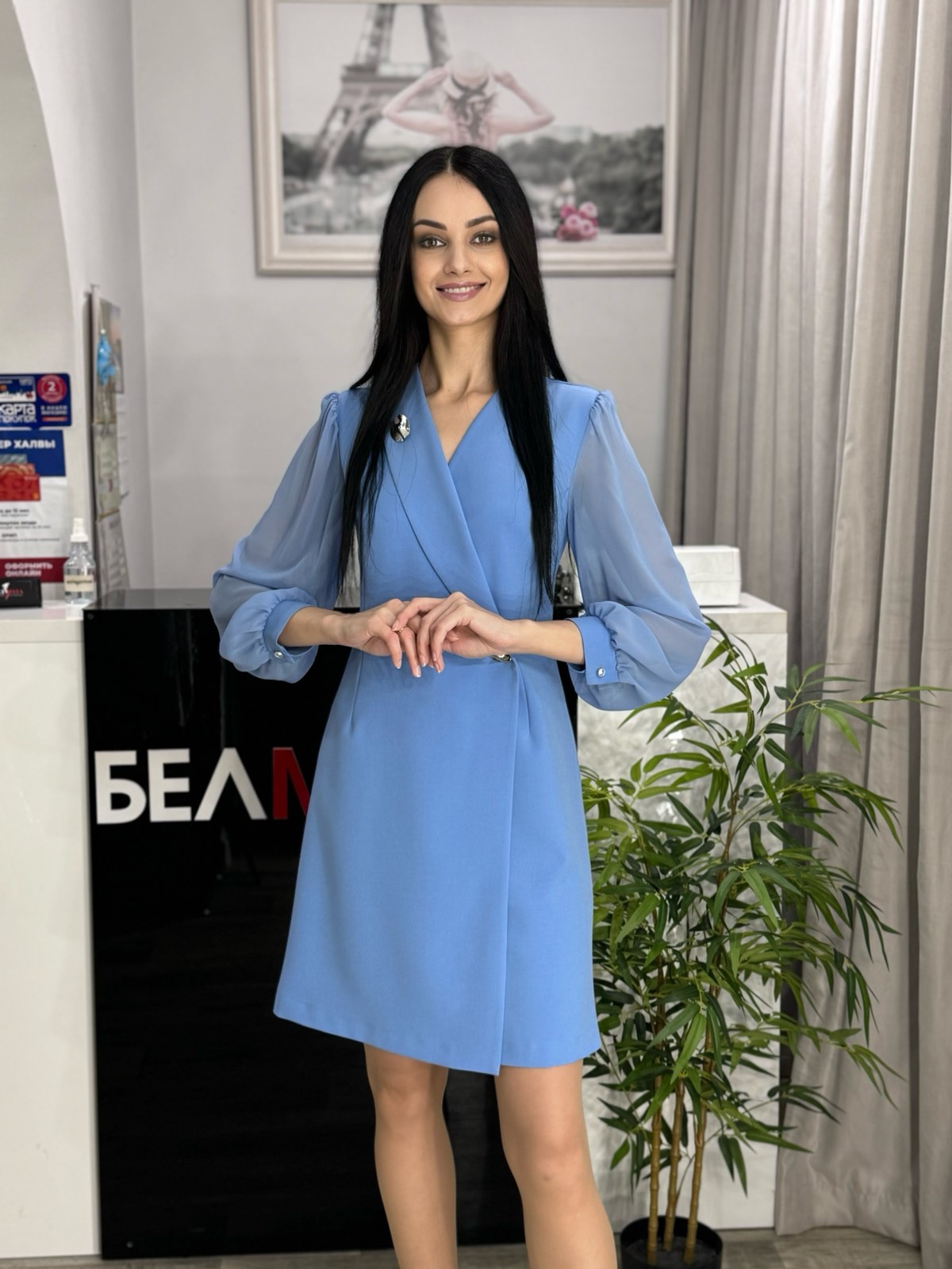 Платье на запах. Модель полуприталенного силуэта, скроенная на запах, расширенная к низу. Рукав шифоновый на манжете. Из декора акцентные пуговицы в контрастном золотом оттенке.