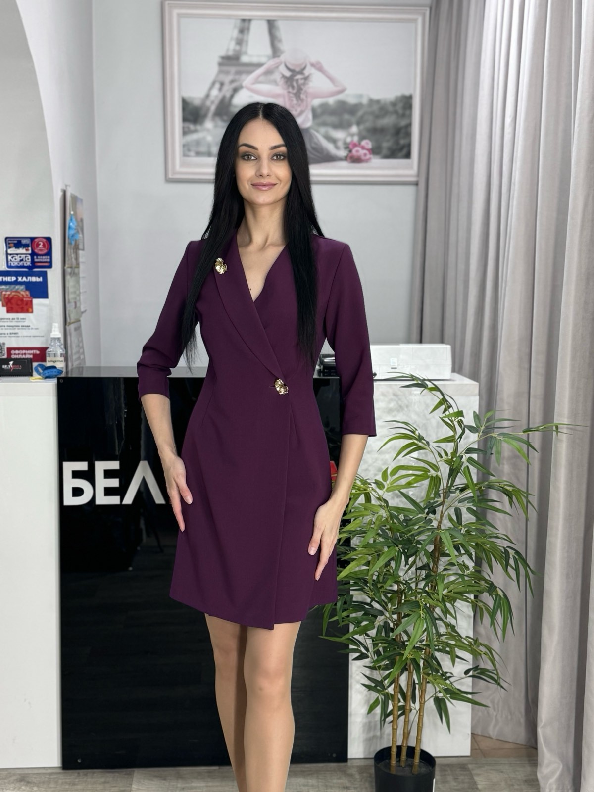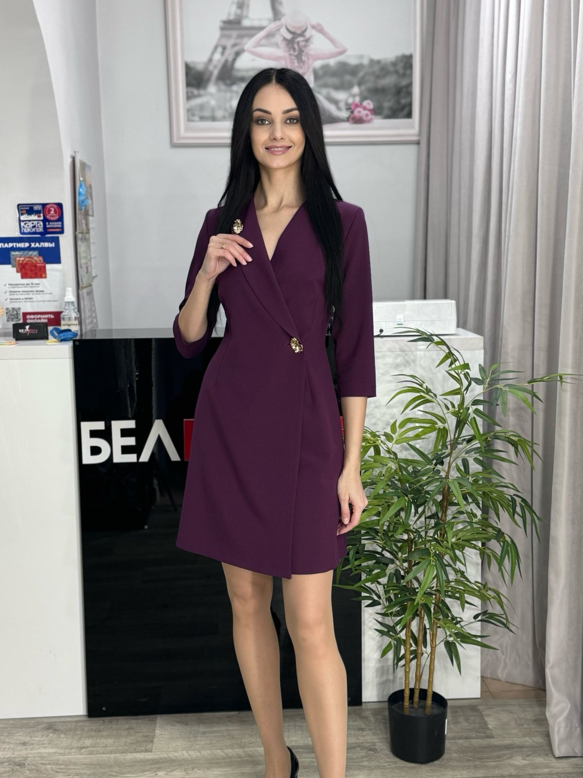 Платье на запах. Модель полуприталенного силуэта, скроенная на запах, расширенная к низу. Рукав 3/4. Из декора акцентные пуговицы в контрастном золотом оттенке.