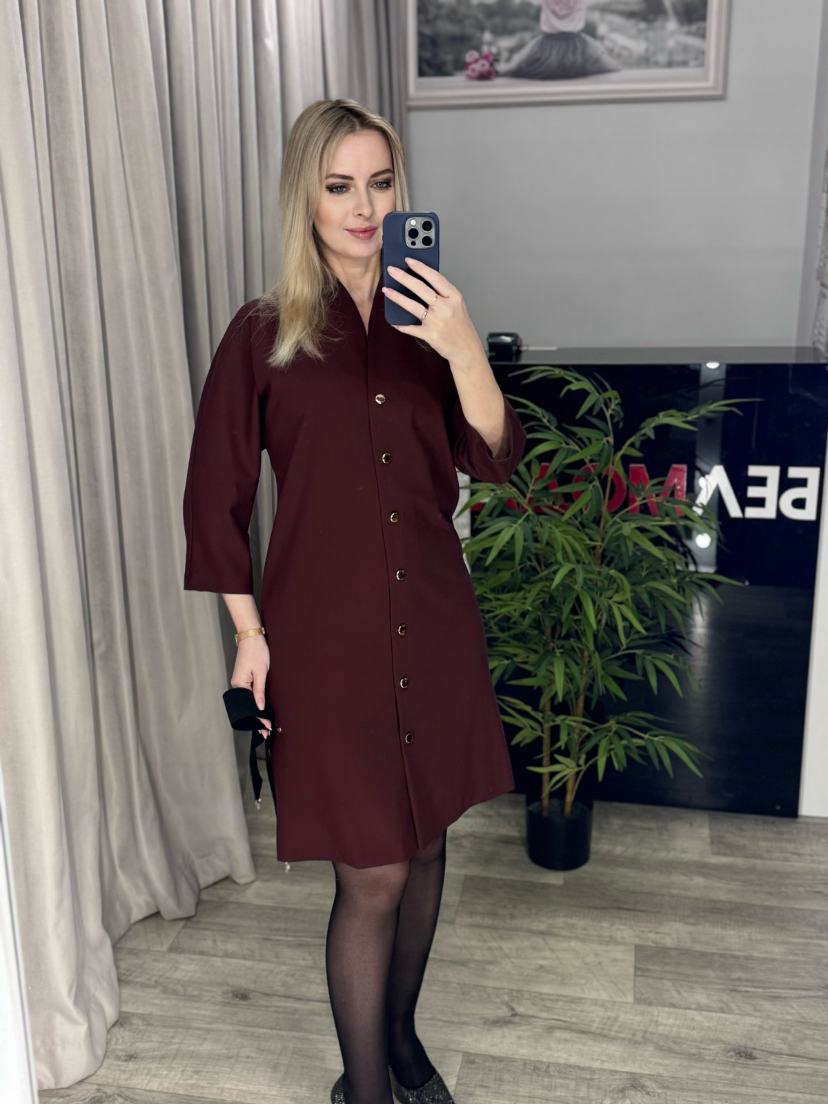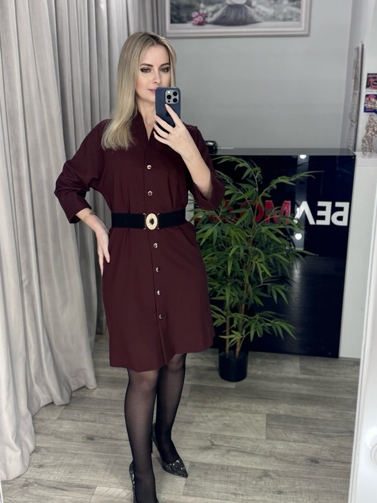 Платье с ремнем-резинкой. Модель прямого кроя, на контрастных золотых пуговицах по всей длине. V-образный вырез, рукав спущенный, без вытачек. Ремень в комплекте.