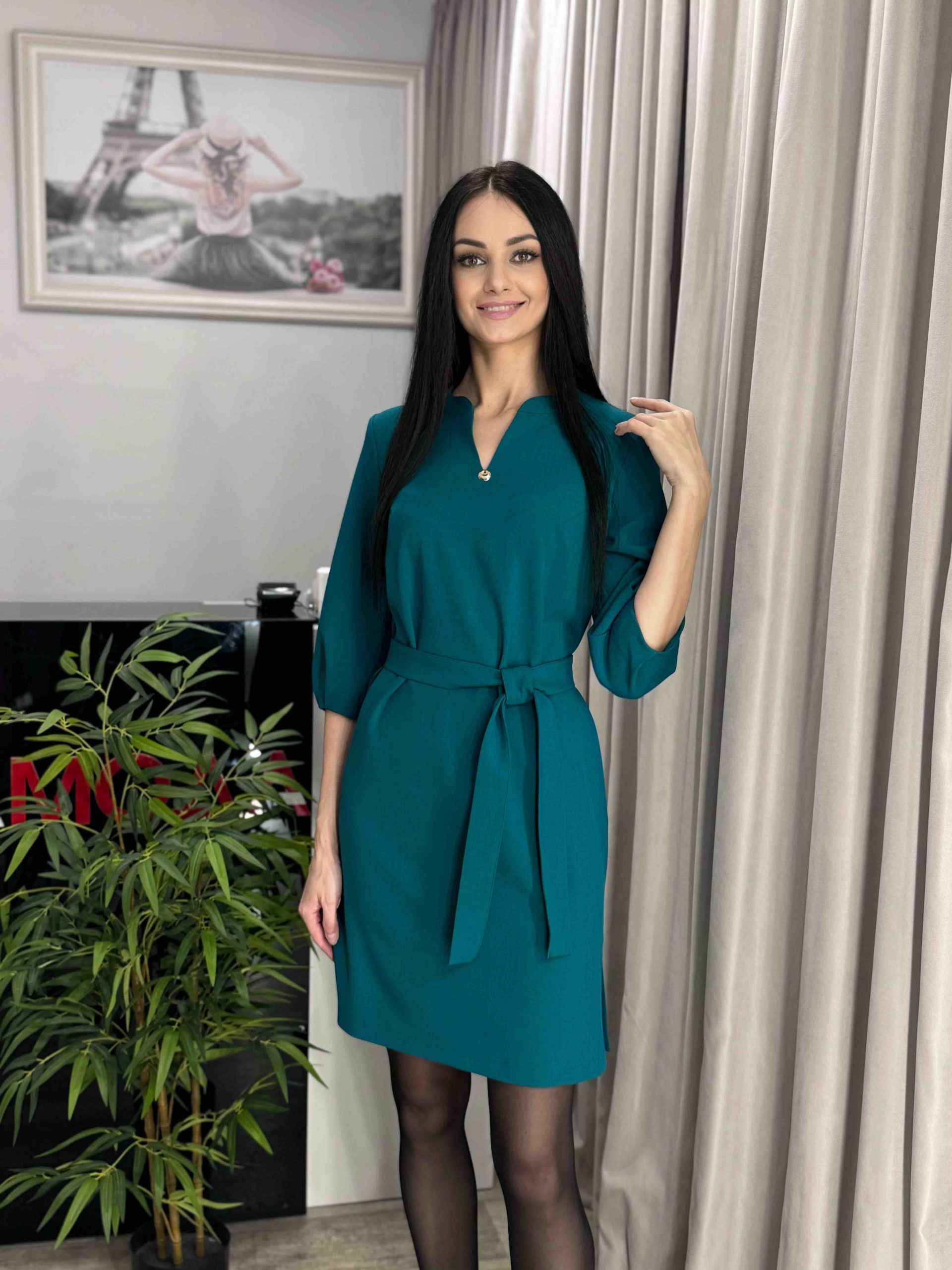 Платье с рукавом «баллоном». Модель полуприлегающего силуэта. V-образный вырез, рукав баллон, снизу по бокам небольшие разрезы. Пояс из основной ткани в комплекте.