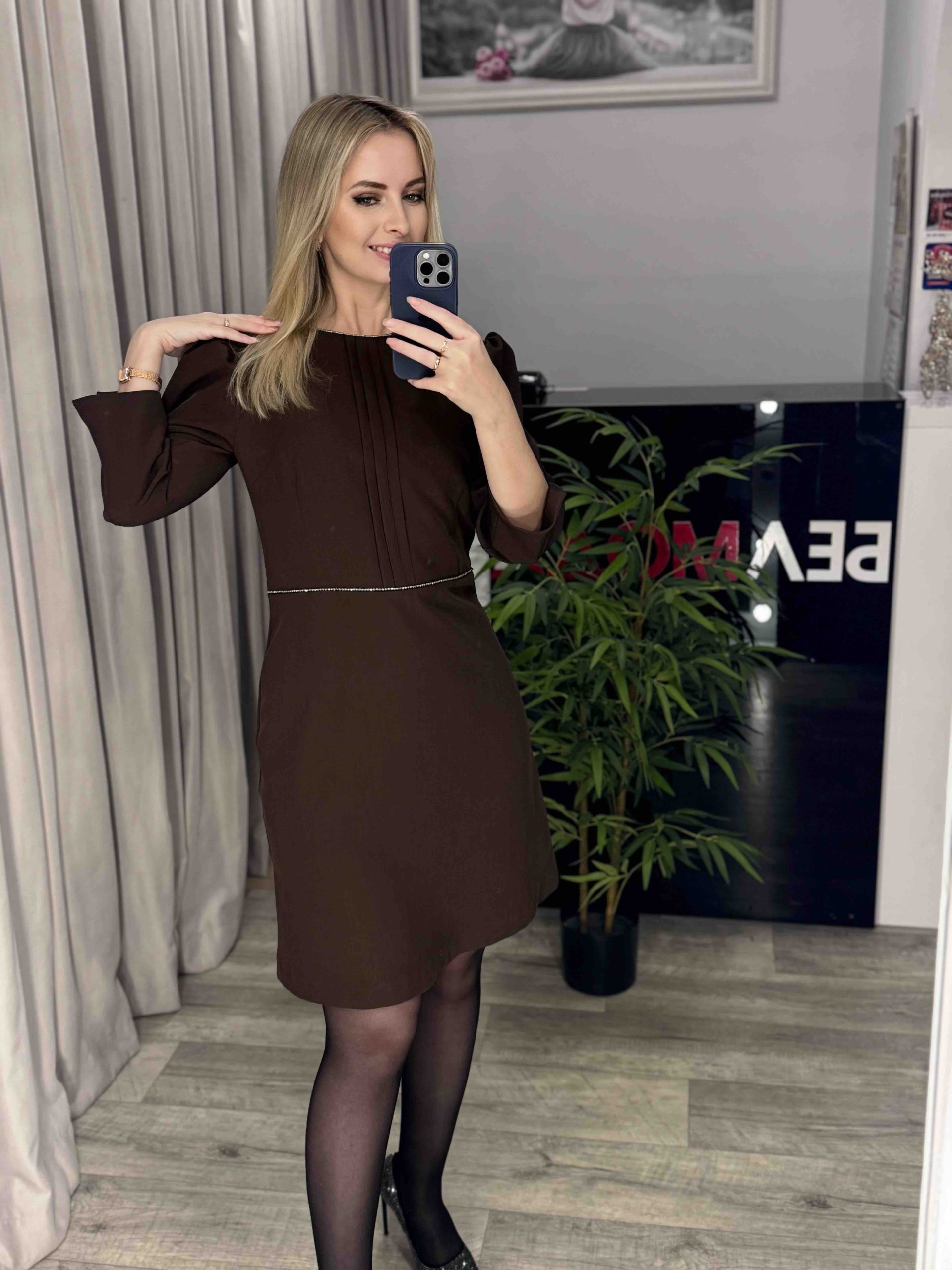Платье с тесьмой из страз. Модель отрезная А-силуэт. С вертикальными складками от горловины до линии отреза и декором в виде тесьмы со стразами по горловине и талии. Рукав 3/4 с небольшой сборкой и разрезом по низу.