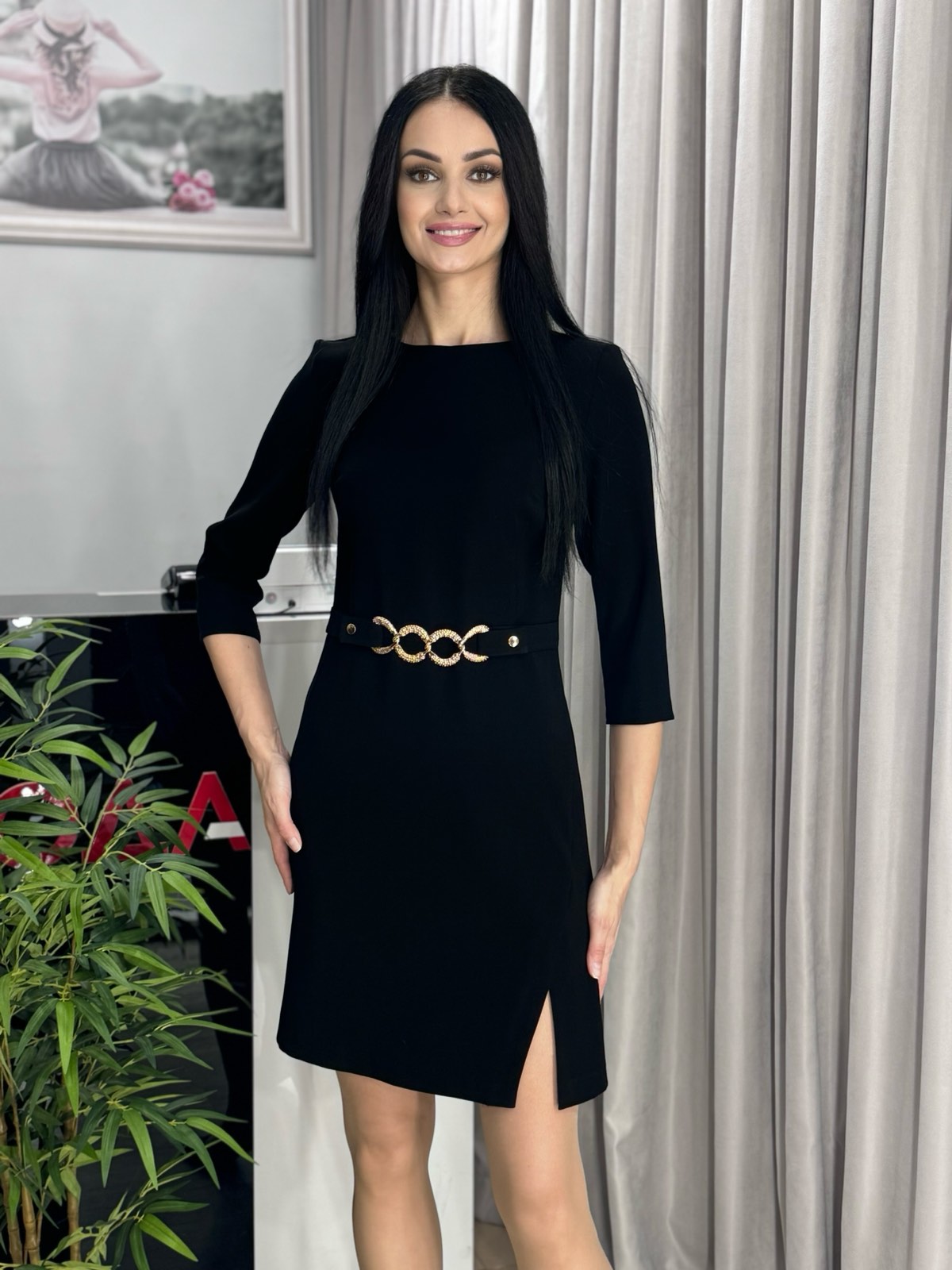 Платье с цепочкой. Модель отрезная с А-образным низом. Рукав 3/4, украшение по талии сьемное. По низу небольшой разрез.