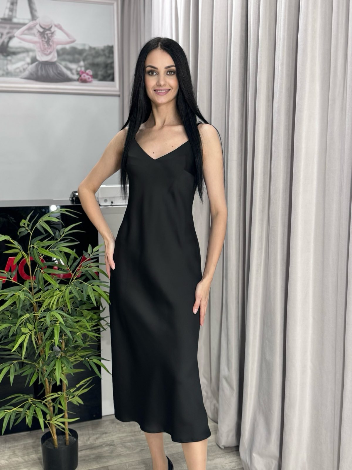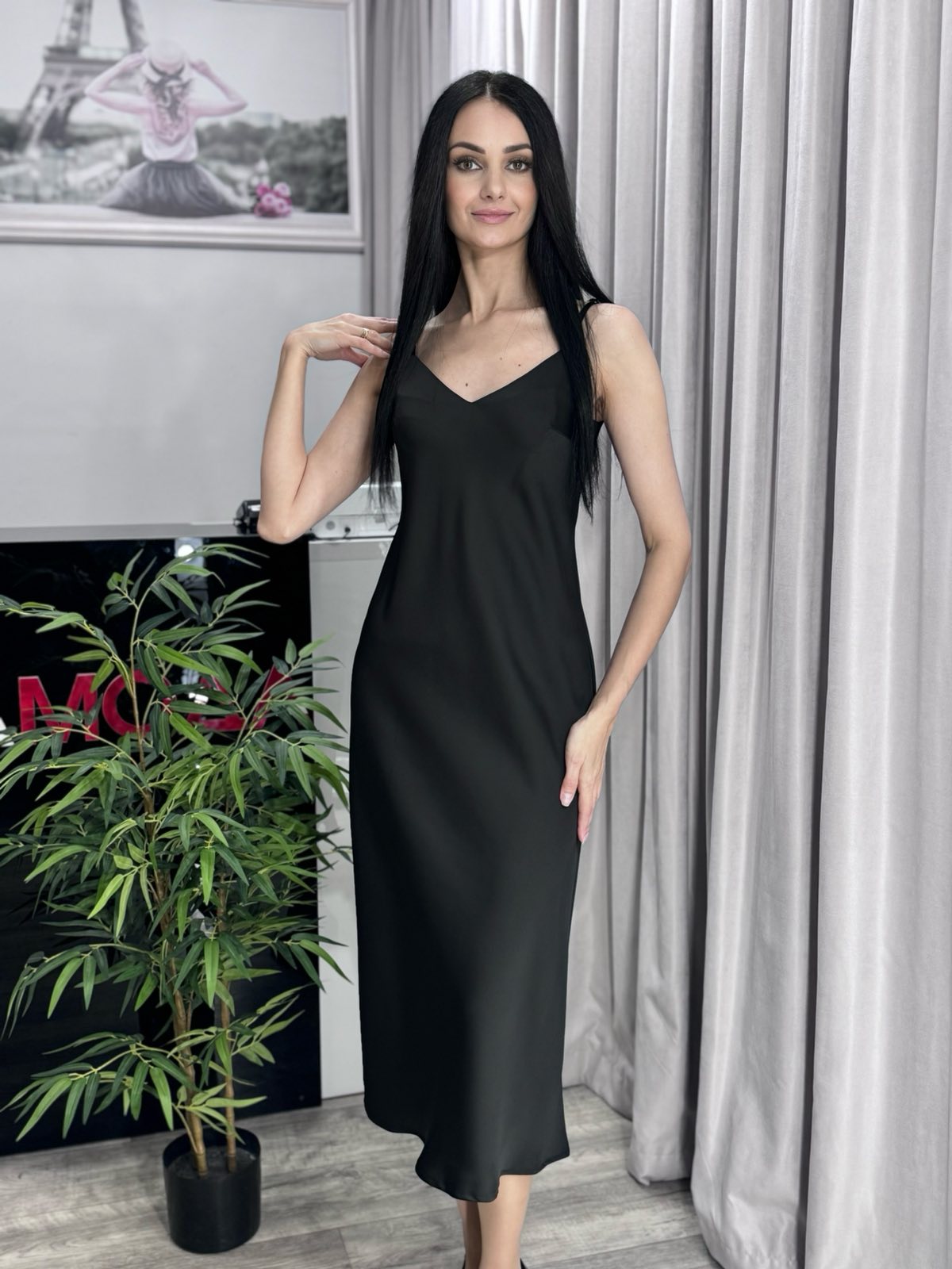 Платье-комбинация. Модель силуэтного кроя в длине «макси» из струящегося атласа, на регулируемых бретелях.