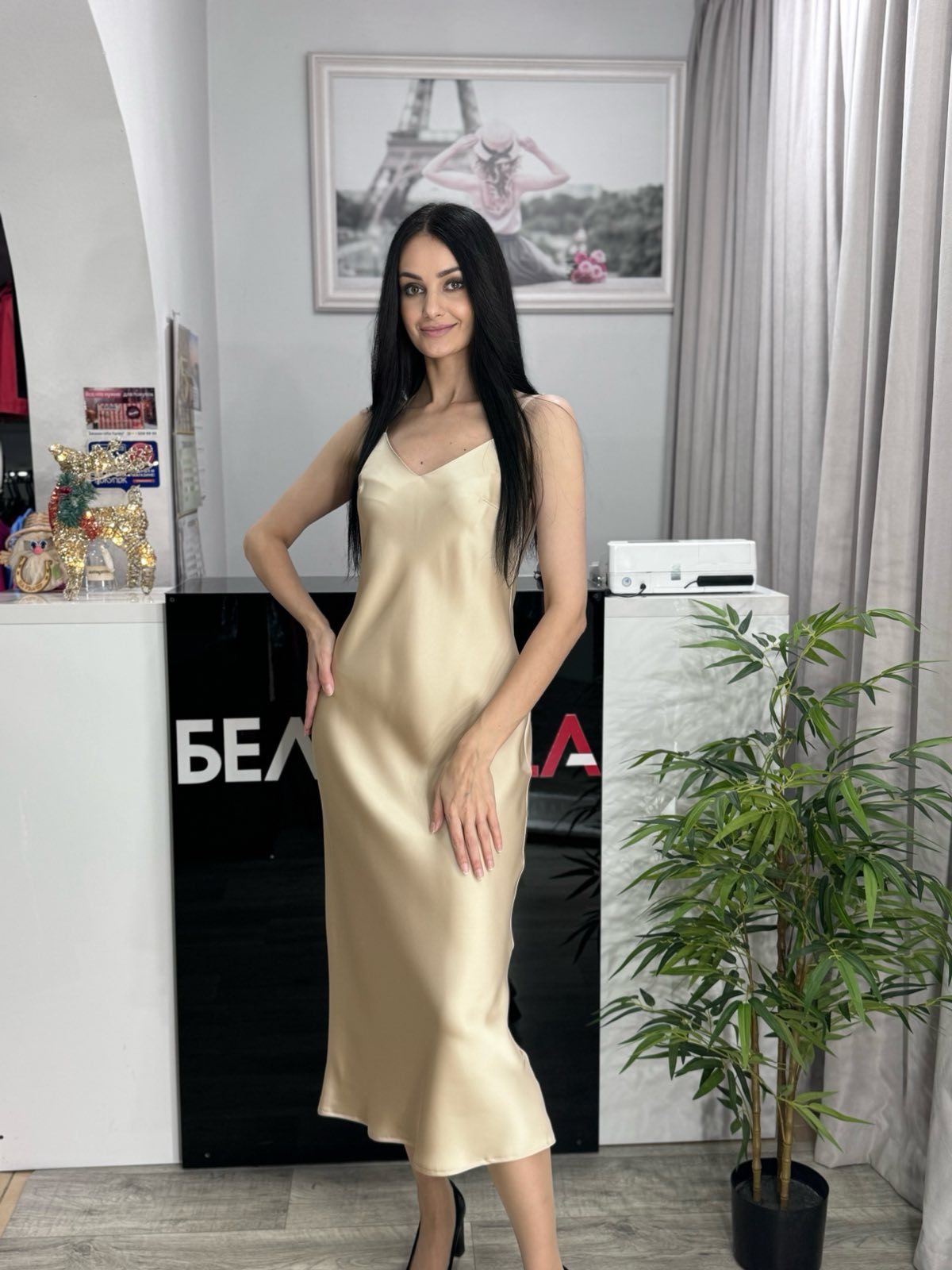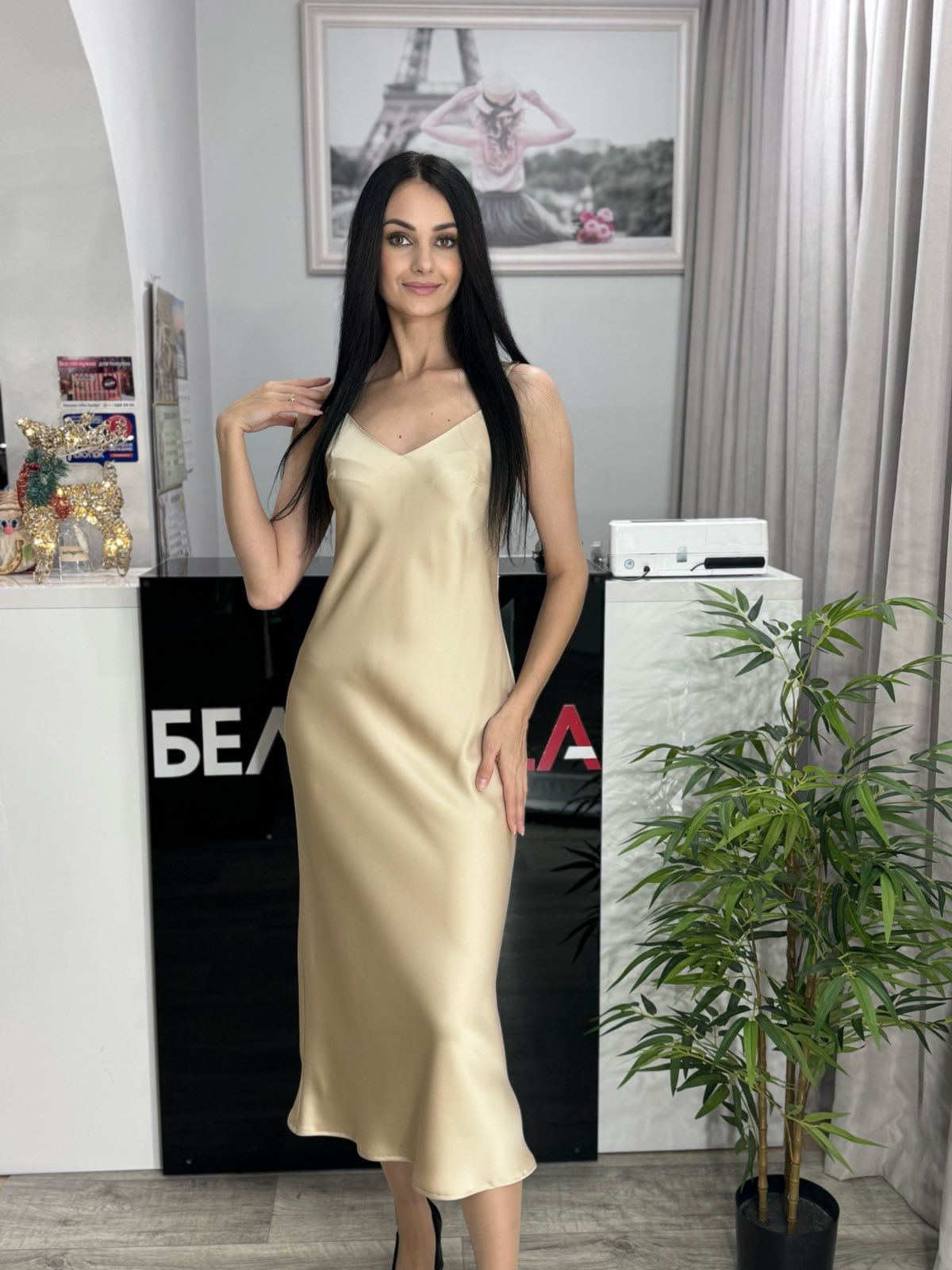 Платье-комбинация. Модель силуэтного кроя в длине «макси» из струящегося атласа, на регулируемых бретелях.