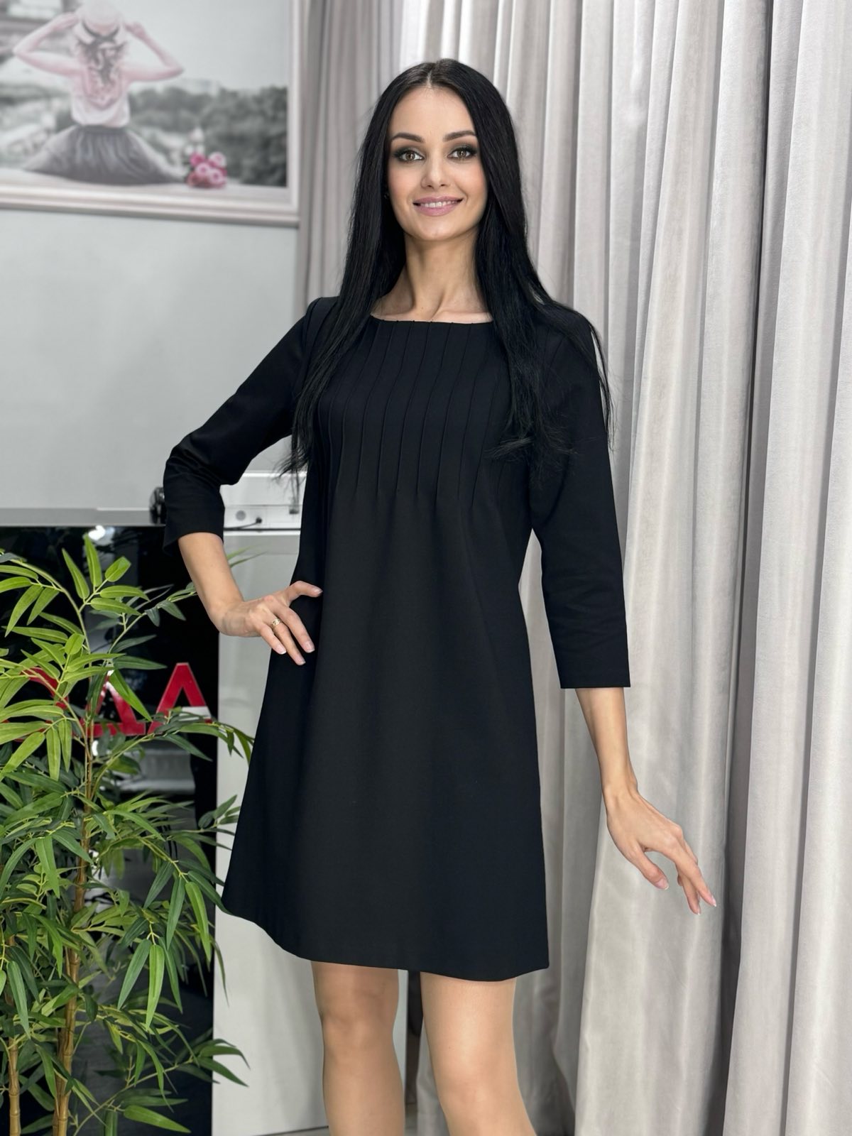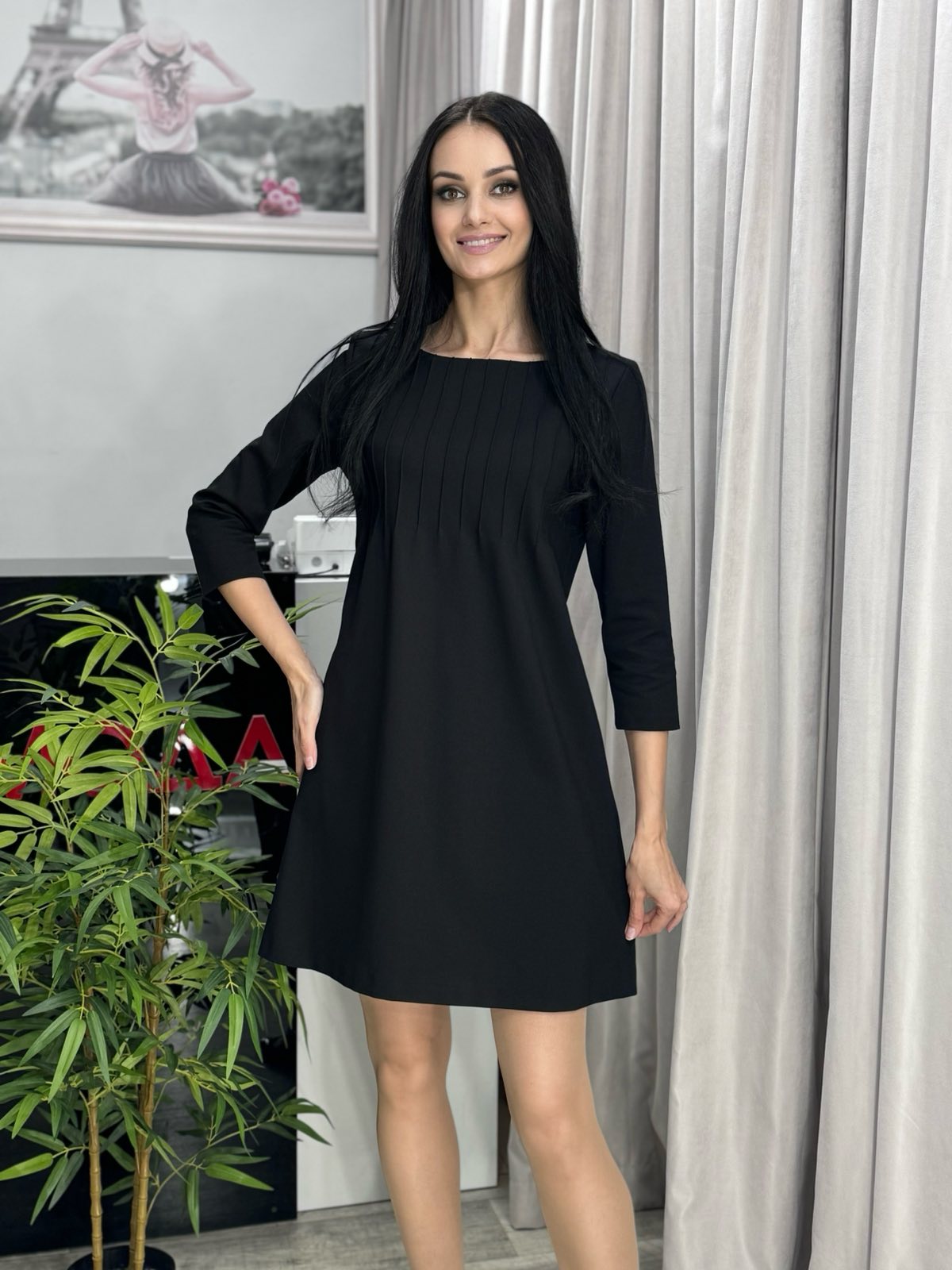 Трикотажное платье. Модель А-силуэта сверху декор в виде застрочек. Рукав 3/4.
