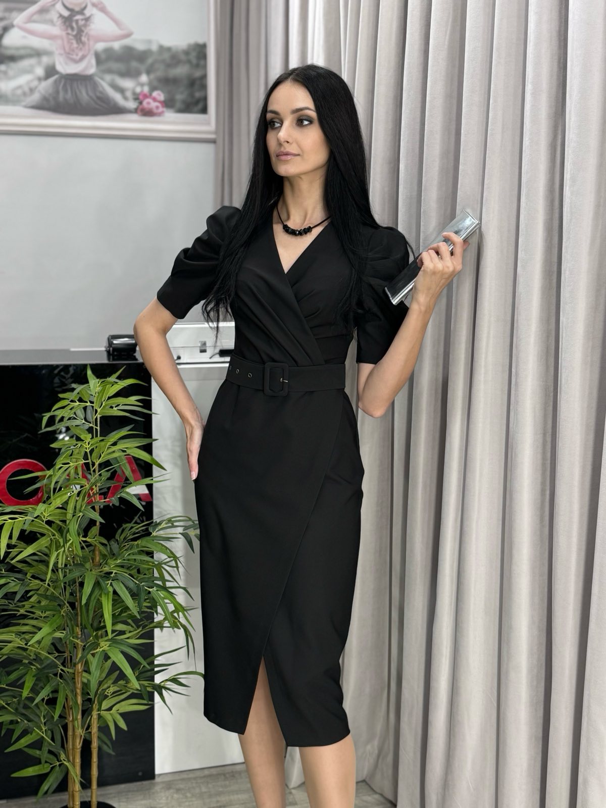 Эффектное вечернее платье в длине ниже колена. Открытая линия декольте, скроенная на запах. Рукав короткий, с встречной складкой. Модель отрезная, имеет силуэтный крой ,низ выполнен на запах с небольшим вырезом по ножке. Пояс из основной ткани с пряжкой в комплекте.